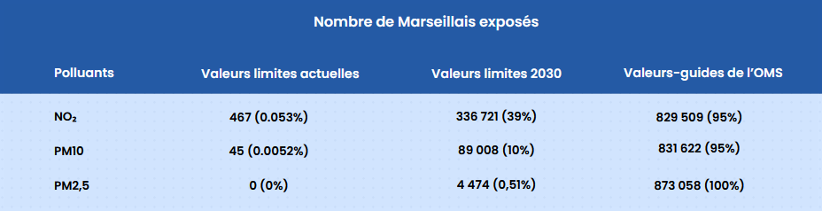 « Si la qualité de l’air tend globalement à s’améliorer, 337 000 Marseillaises et Marseillais, soit 39% de la population, sont encore exposés à la pollution de l’air à Marseille quand on se réfère aux seuils européens pour 2030 », commentait Christine Juste, élue marseillaise à l’Environnement et à la lutte contre la pollution. Autrement dit, près de 4 Marseillais sur 10 susceptibles d’être touchés par des maladies métaboliques (diabète de types 2), cardiovasculaires (AVC, infarctus du myocarde) ou respiratoires (asthme chronique, bronchopneumopathie chronique obstructive). Des impacts sanitaires révélés pour la première fois par Santé Publique France en début d’année. En ce qui concerne les décès annuels prématurés dus à une exposition à long terme aux deux polluants réglementaires, ils se chiffrent à 780 décès (soit 11% de la mortalité marseillaise, toutes causes confondues) pour les particules fines PM2,5, et à 440 décès (6% de la mortalité) pour le dioxyde d’azote (NO2). Au global, la part de la population marseillaise qui meurt chaque année de façon précoce du fait de la pollution atmosphérique est donc plus élevée qu’au niveau national (0,089% vs 0,058%).